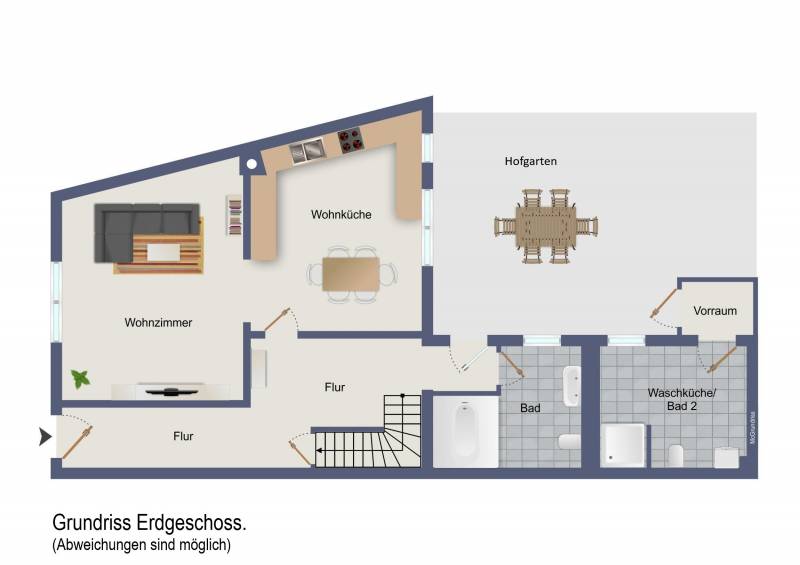 Erdgeschoss: Flur/Diele, Wohnküche, Wohnzimmer, Tageslichtbad mit Eckbadewanne, Hofgarten